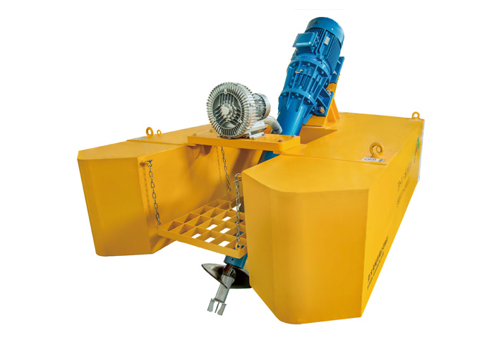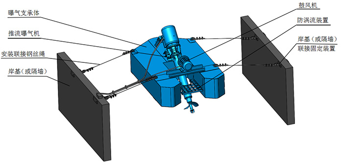推流叶轮与曝气叶轮同时使用,推流叶轮具有推流、搅拌和混合功能;曝气叶轮具有剪切、充氧功能。曝气与推流相结合,推流叶轮的直径是充气叶轮的3~4倍,工作时推流叶轮转动在水下形成负压区,在负压和鼓风机形成的正压力共同作用下,空气被注入水体,曝气叶轮将带有空气的水体切割成细微气泡,从而达到曝气推流的目的。
